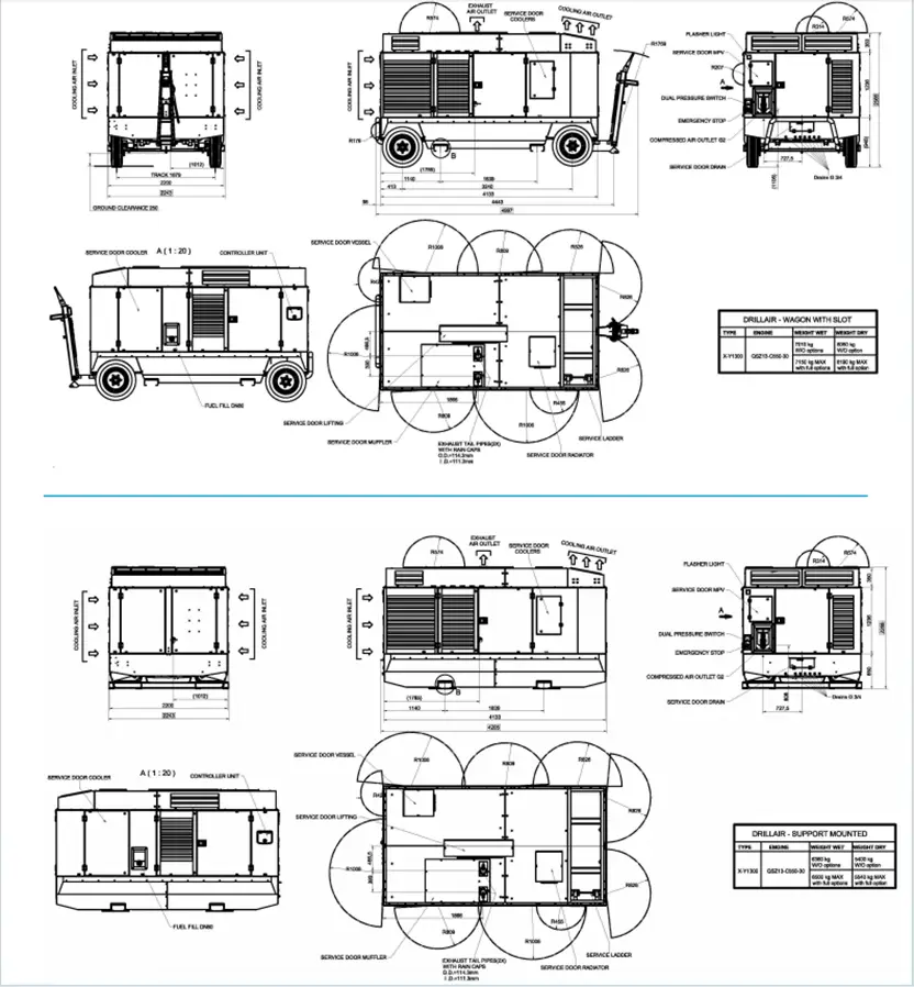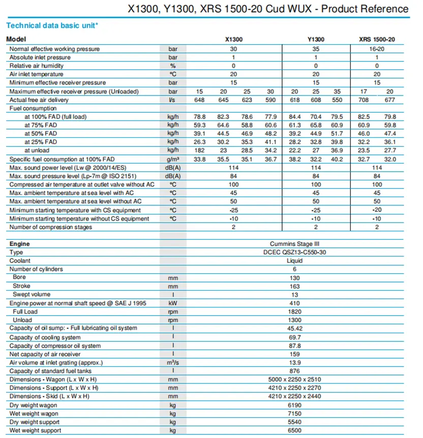 Οι Atlas Copco X1300, Y1300 και XRS 1500-20 είναι σιγαστήρες, δύο σταδίων, με έγχυση λαδιού, κοχλιοφόροι συμπιεστές, που τροφοδοτούνται από εξακύλινδρο κινητήρα ντίζελ Cummins με υγρόψυκτο.