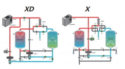 Οι ξηραντήρες προσρόφησης θερμότητας συμπίεσης XD ή X χρησιμοποιούν προσροφητικά υψηλής ποιότητας και χρησιμοποιούν αποτελεσματικά τη θερμότητα συμπίεσης από τον συμπιεστή χωρίς λάδι για την αναγέννηση του προσροφητικού, μειώνοντας σημαντικά την κατανάλωση ενέργειας και το κόστος συντήρησης.