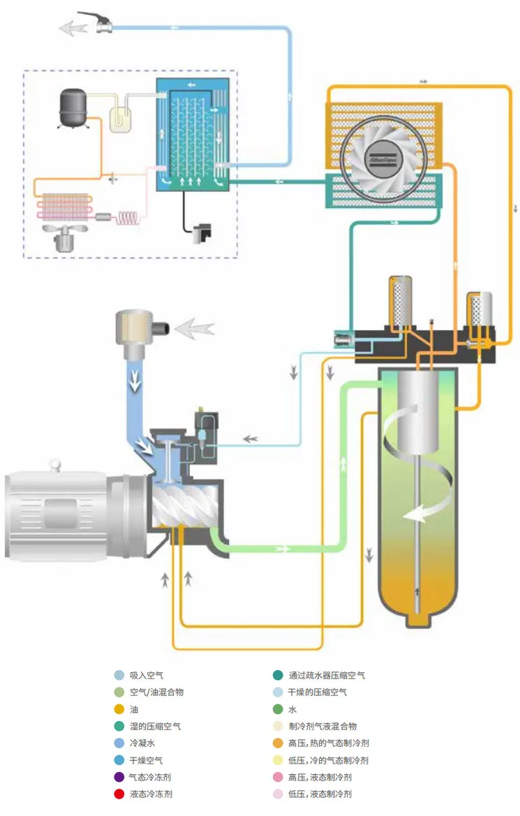 ·Ανεξάρτητος ανεμιστήρας ψύξης, ψυγείο υψηλής απόδοσης και ενσωματωμένο στεγνωτήριο με πίεση σημείου δρόσου 5℃ για καλύτερη αποφυγή συμπυκνωμάτων και διάβρωσης σωλήνων στο δίκτυο σωλήνων