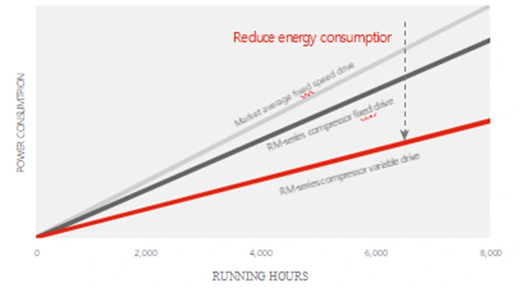 Οι αεροσυμπιεστές RM Screw Air Compressors υιοθετούν όλοι μια ολοκαίνουργια κύρια μονάδα υψηλής απόδοσης, που συνδυάζει τεχνολογίες ενεργειακά αποδοτικών κινητήρων IE3 σταθερής συχνότητας και μετατροπέα μόνιμου μαγνήτη ECO*-PM IE5, οι οποίες μπορούν να σας εξοικονομήσουν έως και 12-30% στο κόστος ηλεκτρικής ενέργειας.