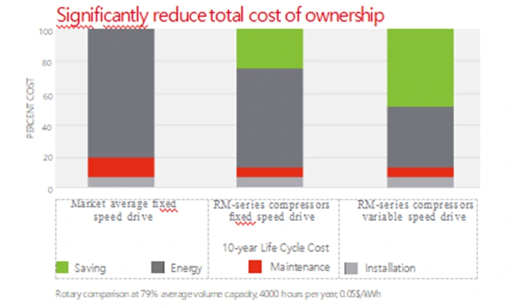Αναπτύξαμε τη νέα σειρά RM χρησιμοποιώντας υπερσύγχρονες μονάδες συμπιεστή, σχεδιασμένες να σας παρέχουν ανώτερη απόδοση. Μέσω βελτιστοποιημένων προφίλ ρότορα και άλλων βελτιώσεων, η νέα μονάδα συμπιεστή επιτυγχάνει 11% αύξηση στην απόδοση και σημαντική μείωση του λειτουργικού κόστους. Επιπλέον, το νέο προφίλ ρότορα επιτυγχάνει ιδανική χωρητικότητα αέρα, 11% υψηλότερη από την προηγούμενη γενιά. Χαμηλότερη αναλογία ισχύος προς βάρος σημαίνει χαμηλότερο κόστος επένδυσης εξοπλισμού και κατανάλωση ενέργειας, μειώνοντας έτσι το συνολικό κόστος ιδιοκτησίας.