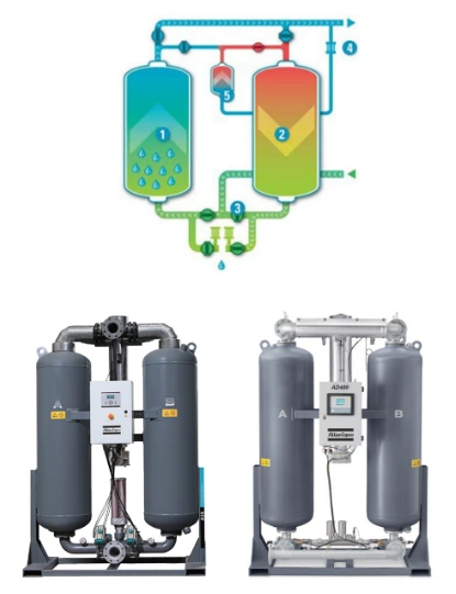 Οι ξηραντήρες προσρόφησης με αναγεννητική θερμότητα της σειράς Α χρησιμοποιούν ένα ξηραντικό για την απορρόφηση της υγρασίας από τον πεπιεσμένο αέρα. Κάθε μηχανή αποτελείται από δύο πανομοιότυπους πύργους. Αλλάζουν λειτουργίες μετά από κάθε κύκλο.