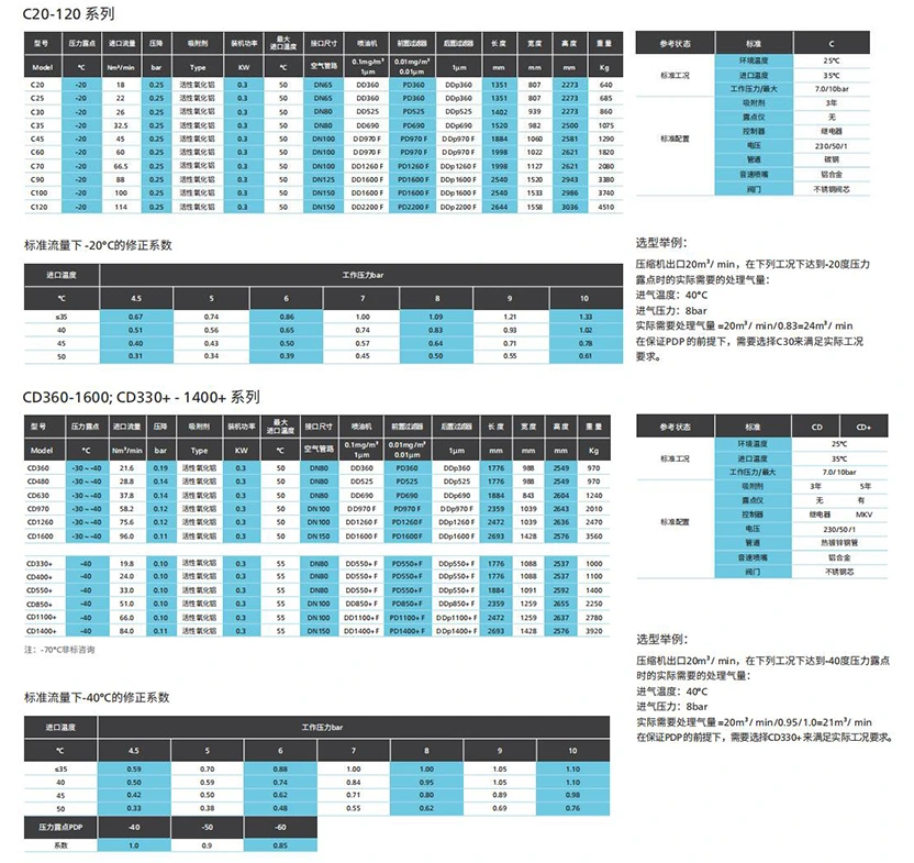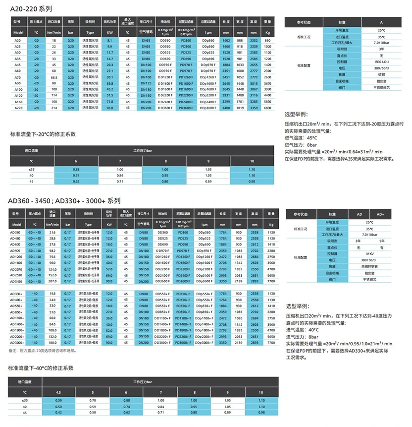 Ανάλογα με το σημείο δρόσου πίεσης, το ξηραντικό μπορεί να είναι αλουμίνα ή υλικά μοριακού κόσκινου. Το χαμηλότερο σημείο δρόσου πίεσης μπορεί να φτάσει τους -70°C.
