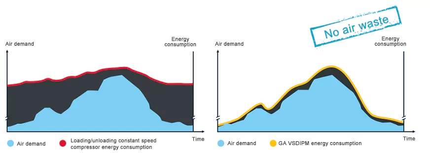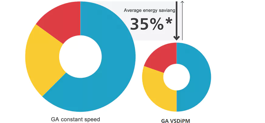 Η σειρά VSDiPM της Atlas Copco μπορεί να προσαρμόσει αυτόματα την ταχύτητα του κινητήρα για να ελέγχει με ακρίβεια και να ανταποκρίνεται στις απαιτήσεις χρήσης αερίου των πελατών. Σε σύγκριση με τους συμπιεστές που κινούνται από την καθορισμένη ταχύτητα, ο αεροσυμπιεστής μεταβλητής συχνότητας VSD εξοικονομεί έως και 35% κατά μέσο όρο ενέργειας.